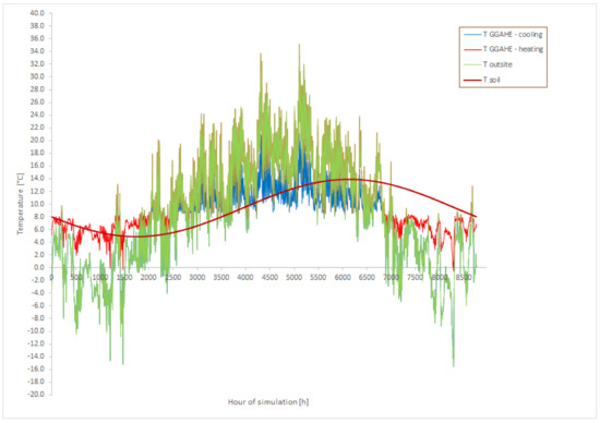 Simulations were prepared using meteorological data of the Poznań City (EN-ISO 15927:4). The climatic data take into account the dry- and wet-bulb temperature variations, relative humidity, and moisture content for every hour of the year. The main point of the simulation is to examine changes in temperature and relative humidity of the external air flowing through the GGAHE into the building throughout the year.
