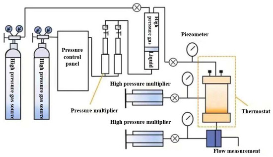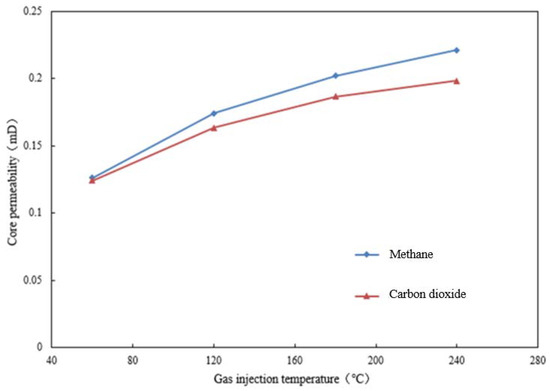 Figure 4 shows the relationship between gas injection temperature and core permeability. In Figure 4, under the same experimental conditions, the core’s permeability increases gradually with the increase in drying gas temperature, but the range of increase decreases. Compared with carbon dioxide, the drying effect of methane is superior. The specific performance is that the recovery value of core permeability is higher at the same drying temperature. Under the condition of injecting drying gas at the same temperature, the heat loss of methane in the core is higher because of its higher specific heat capacity. On the one hand, the loss of heat heats the rock itself. On the other hand, more heat is released and evaporates, carrying more bound water in the core’s pores, and its viscosity is higher. Therefore, methane has a stronger carrying effect on bound water in the core’s pores, and the recovery value of core permeability is higher.