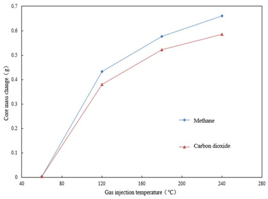 Figure 2 shows the relationship between gas injection temperature and core mass change. For the same type of gas injection, the change in core mass increases with an increase in gas-injection temperature. However, the range of increases gradually decreases. Compared with carbon dioxide injection, the core’s mass changes more after methane injections.