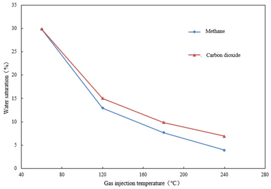 Figure 3 shows the relationship between gas injection temperature and core water saturation. In Figure 3, with the increase of temperature of gas injection, the core water saturation decreases, but the trend of the decrease decreases gradually. When the gas-injection temperature reaches 120 °C, the decreasing rate of core water saturation slows down. Compared with carbon dioxide injection, water saturation in the core decreases greatly after methane injection, which indicates that methane has a stronger carrying effect on irreducible water block effects in the core.
