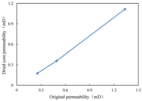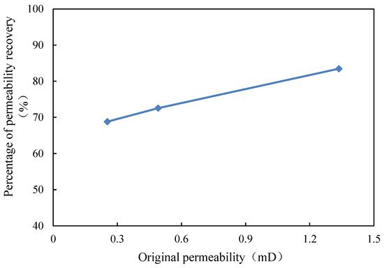 Figure 5 shows the relationship between desiccated core permeability and original permeability. And Figure 6 shows the relationship between the permeability recovery rate and the original permeability. In Figure 5, with the increase of original permeability, the permeability of dried cores increases. In Figure 6, with the increase of original permeability, the core permeability recovery rate increases. The results show that the hydrolytic effect of hot gas is better for cores with higher permeability.