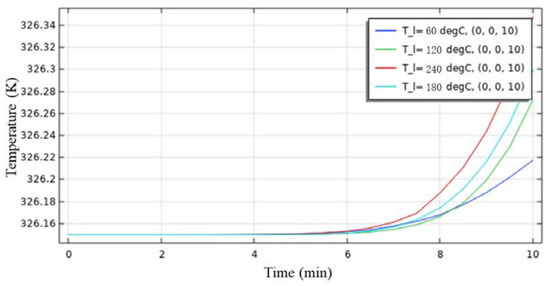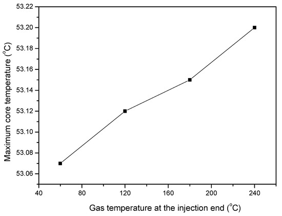 Figure 9 shows the maximum temperature in cores with different injection gas temperature. In Figure 9, when the injection temperature is 60 °C, the core temperature increases continuously, and the maximum value is 53.07 °C. When the injection temperature is 120 °C, the maximum core temperature is 53.12 °C. When the injection temperature is 180 °C, the maximum core temperature is 53.15 °C. When the injection temperature is 240 °C, the maximum core temperature is 53.2 °C.