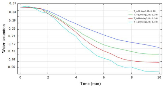 When the original water saturation of the core is 35%, carbon dioxide gas at 60 °C, 120 °C, 180 °C, and 240 °C is injected, and the water saturation content in the core changes with different cumulative injection times. As observed in Figure 10, with the increase in carbon dioxide injection times, the remaining water saturation in the core decreases gradually. When the cumulative injection time is 2 min, 4 min, 6 min, and 8 min, the distribution of core residual water saturation is as shown in the figure; thus the temperature injection of carbon dioxide directly affects the water cut of the core. When the injection temperature is 60 °C, the core’s residual water saturation decreases continuously, and the minimum value is 15%. When the injection temperature is 120 °C, the core’s residual water saturation decreases continuously, and the minimum value is 11%. When the injection temperature is 180 °C, the core’s residual water saturation decreases continuously, and the minimum value is 8%. When the injection temperature is 240 °C, the core’s residual water saturation decreases continuously, and the minimum value is 3%, which is shown in Figure 11.