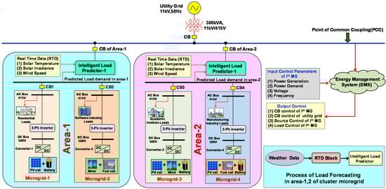 The proposed system is separated into two areas: area-1 and area-2, both of which are deemed interoperable inside the cluster. Area-1 is formed by connecting Microgrid-1 (Residential Building) and Microgrid-2 (Software Building) and area-2 is formed by connecting Microgrid-3 (Academic Institute Building) and Microgrid-4 (Manufacturing Industry Building) in the selected location. These interconnected and interoperable areas are further integrated into the conventional grid through the Common Coupling Point. Each area in the cluster microgrids is equipped with renewable sources which are available freely in that location and also consists of two microgrids with local agent controllers of that building and an intelligent forecaster with a Real-Time Data (RTD) measurement block. The interrelated cluster microgrid is considered in such a way that it has to operate in both self-standing modes and also in grid-related modes. The RTD block collects the real-time information on solar temperature, irradiance, speed of the wind turbine, and predicted load demand from the selected location. The output data from the RTD block is applied to the corresponding intelligent predictor for forecasting. Forecasted load demand information of the cluster microgrid is applied as an input for the energy management system to function effectively. Correspondingly, the energy management system produces the control signals to the circuit breaker to import or export based upon the energy needs. The energy management system in this architecture is designed to make the energy transactions during excess/deficit power conditions to/from the neighborhood area or utility grid. However, the complete modelling of all renewable sources and constituents is given in []. Table 1 contains the information on various parameters considered for the simulation of the cluster microgrid system.
