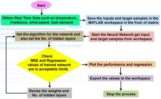 Figure 6 depicts the flowchart of the intelligent predictor, i.e., artificial neural network (ANN), which is to be implemented in the Simulink environment. ANN is very flexible and can be easily adaptable to all complex nonlinear problems. The following are the steps to be taken for training the ANN with different weight updating algorithms: