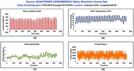 The goal of this work is to determine the best day-ahead load demand forecasting solution in cluster microgrids. We gathered data on solar and wind factors from Vijayawada city in the state of A.P., India, with a “location ID” of 44665, a latitude of −16.65°, and a longitude of −80.65° [,]. Figure 7a–d shows the characteristics of the actual dataset, such as solar irradiance, temperature, wind speed, and the electric load consumption in a specified location for one month from 1 January 2019 to 31 January 2019. Test data are considered for the period from 10 January 2019 to 16 January 2019. Our job is to calculate daily, weekly, and monthly electricity usage by predicting consumption for each hour of the day. Machine learning algorithms anticipate the future value of a time series data collection by discovering correlations between historical data attributes and using the revealed associations to forecast the future value.