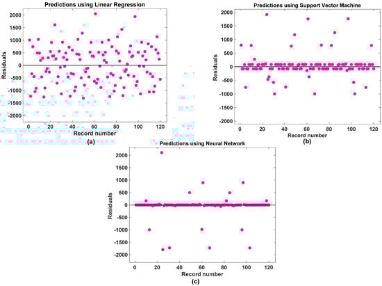 So, Figure 9 shows the typical residual plots of all the machine learning methods used. Curve fitting is described as the model that provides the greatest fit to the specific curves in one’s dataset in regression analysis. Linear connections are easier to fit and interpret than curved variable relationships. We use root mean square error (RMSE), R-squared, mean square error (MSE), mean absolute error (MAE), mean absolute percentage error (MAPE), and time of computation metrics to assess the prediction accuracy of each machine learning model in all cases. The forecasting error metrics are obtained as given in Equations (16)–(20).