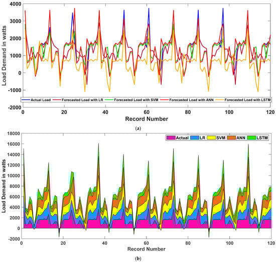 Cluster microgrid load profile plots. (a) Actual vs. forecasted load demands with LR (quadratic), SVM, ANN and LSTM. (b) Area plot with LR (quadratic), SVM, ANN, and LSTM.