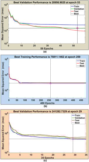 Performance plots of ANN with (a) Levenberg–Marquardt (LM) algorithm, (b) Bayesian Regulation (BR) algorithm, and (c) Scaled Conjugate Gradient (SCG) algorithm.