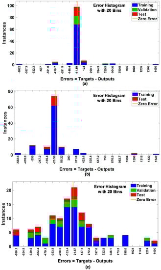 Error histogram plots of ANN with (a) Levenberg–Marquardt (LM) algorithm, (b) Bayesian Regulation (BR) algorithm, and (c) Scaled Conjugate Gradient (SCG) algorithm.