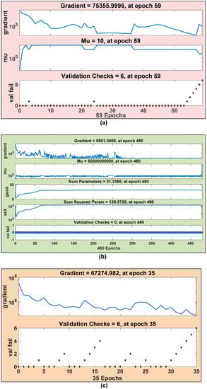 Training state plots of ANN with (a) Levenberg–Marquardt (LM) algorithm, (b) Bayesian Regulation (BR) algorithm, and (c) Scaled Conjugate Gradient (SCG) algorithm.