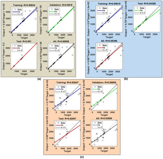 Regression plots of ANN with (a) Levenberg–Marquardt (LM) algorithm, (b) Bayesian Regulation (BR) algorithm, and (c) Scaled Conjugate Gradient (SCG) algorithm.