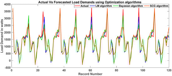 In terms of data training, validation, and testing, the values generated by regression demonstrate the relationship between target samples and output samples. If R = 1 on the regression in Figure 15, the line is angled at 45 degrees to the x-axis, suggesting that the target and output are the same. When the output sample and the target values are closely related, the value of “R” may be one. If the ANN regression values for all examples are greater than 0.95, the curve fitting is considered to be reasonably valid. From Table 3, it is observed that in all the cases of regression analysis, the Levenberg–Marquardt optimization algorithm plays a dominant role. Hence, we proposed LM-based ANN for forecasting day-ahead load demands in cluster microgrids. Actual and forecasted values of day-ahead load demand in the cluster microgrid with different optimization algorithms based on ANN are shown in Figure 16. From the results, it is observed that ANN with the Levenberg–Marquardt optimization algorithm gives fruitful results. Hence, we proposed LM algorithm-based ANN for day-ahead load demand forecasting.
