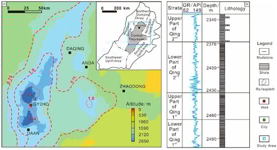 Geological overview of the study area. (a) Tectonic unit of the Songliao Basin and the location of the study area; (b) lithological column map of the Gulong 3HC well logs [2].