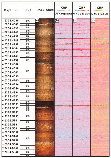 In this paper, a full-diameter black organic-rich high-clay-mineral core sample was collected from well GY2HC (indicated by the red dot in Figure 1a), with a length of 17 cm and a diameter of 10 cm. First, the sample was cut into two parts, perpendicular to the laminar direction at about one-third of the diameter, and trimmed to obtain a rectangular piece for XRF scanning. The flat surface of the rectangular piece was examined under an M4 Tornado high-performance micro-area X-ray fluorescence spectrometer to obtain the longitudinal lamina characteristics and element distribution. The scan step was 20 µm and the energy was 40 keV. The XRD results and the longitudinal elements of XRF confirmed the main mineral types in the study area (illite, quartz, feldspar, carbonate minerals, and pyrite) and the corresponding key elements (Ca, Fe, Si, K, Mg and Al). Combining the elements Al, Mg, K, Na and Si yielded a pink, mixed-blue XRF image that confirms that the developmental background of the sample is clay minerals (Figure 2b). Furthermore, Ca and Fe, which vary significantly in the longitudinal direction, were rendered as red and yellow stripes to identify Ostracod laminae (Figure 2c,d) and the XRF sample was prepared into rock thin sections to identify felsic lamina (Figure 2a). A lamina division scheme for the Gulong organic-rich shale was established, with three distinct units: UA (clay mineral laminae), UB (clay mineral-Ostracod laminae), and UC (clay mineral-felsic laminae). The remaining column samples were cut parallel to the laminar direction to obtain 32 single lamina samples, which were then subjected to secondary testing.