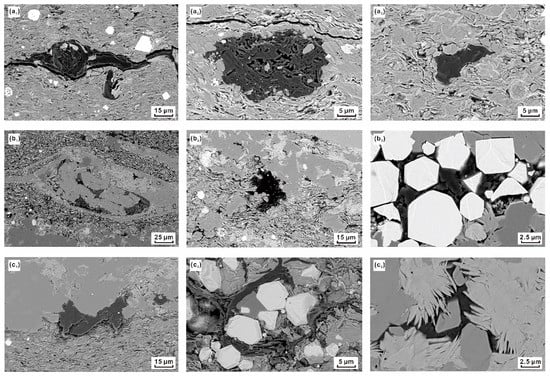 UC is dominated by mineral intergranular pores, including brittle mineral intergranular pores and clay mineral intergranular pores (Figure 4c). Intergranular pores of feldspar and quartz grains are commonly filled with illite, black mica, and organic matter (Figure 4c1). The pores are predominantly micron-sized, up to 5 μm (Figure 4c1–5c3). UC mainly develops gap-filling organic matter and irregularly agglomerated organic matter. Among them, the pore size of the gap-filling organic matter is small, between 10 and 100 nm, and grows in the shape of stripes and patterns (Figure 5c2). The organic matter network is poorly connected because part of the micro and nano pores of gap-filling organic matter can be seen to be covered by illite (Figure 5c3). Irregularly agglomerated organic matter is associated with quartz and clay minerals, developing honeycomb nanopores (Figure 5c1).