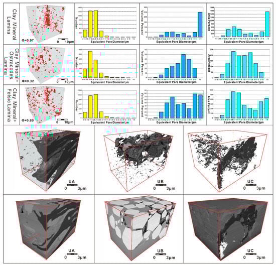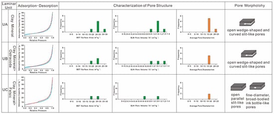 UC develops fine-diameter, broad-bodied ink-bottle-like pores within the felsic lamina, while parallel slit-like pores develop in the clay minerals laminae. It could be found that the adsorption of UA is greater than UC than UB, which shows that the higher the clay mineral content, the higher the corresponding adsorption amount. The adsorption volumes were obtained by performing a function of nano small-scale pores and specific surface area, indicating that the clay minerals were the main contributors to the pore volume and specific surface area of the selected samples.
