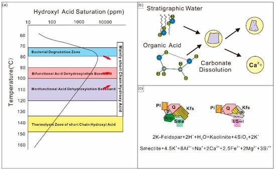 Diagenetic influences on different laminae. (a) the variation of hydroxyl acid saturation at different temperature, (b) the reaction between carbonate minerals and organic acid; (c) the process of transforming from montmorillonite to illite.