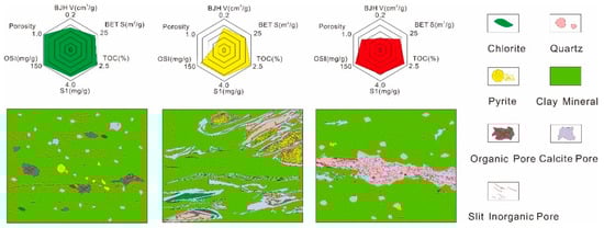To further explore the influence of the development of different laminae reservoir qualities from a microscopic perspective, the “source” (S1, oil transcendence index and total organic carbon content), and “reservoir” (mineral type, fracture, pore morphology, BJH specific pore volume, BET specific surface area and porosity) are characterized and spatially matched to establish reservoir development patterns for different laminae in high-clay-mineral shales (Figure 9).