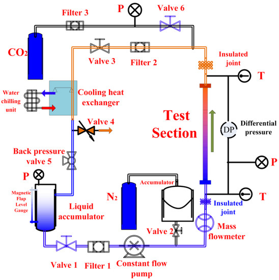 An experimental loop (Figure 1) was laid out and constructed to quantify heat transfer in the vertical upward flow for supercritical carbon dioxide. The major parameters that were controlled and measured were inlet pressure, heat flux, mass flux, fluid, and wall temperature. Before running the system, the air of the system was removed by a vacuum pump, and then the system was kept at a certain vacuum to check the sealing of system tubes. We started the water chilling unit and then charged the system with a high-pressure CO2 cylinder. CO2 was liquefied under high pressure and stored in the liquid accumulator. The constant-flow pump drove the liquid CO2 into the experimental loop. The accumulator that connected with the N2 cylinder was used to reduce the fluctuations. The fluid of the experimental section was heated by the direct electric heating method. After that, the high-temperature fluid flowed through the cooling heat exchanger in order to cool down and enter the liquid accumulator. Then, the closed carbon dioxide flow circulation was established.