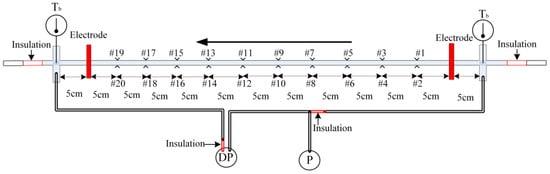 Figure 2 shows the detailed arrangement of measurement points. The test section was a vertical mini upward tube. The length of the heated test section was 55 cm, and the inlet diameter and the thickness of the tube were 2 mm and 0.5 mm, respectively. The inlet and outlet of the test section were installed sheathed thermocouple and pressure transmitters (Manufacturer: Rosemount, Model: 3051 capacitance-type, Market Blvd Chanhassen, MN, USA) to obtain the fluid temperature and pressure drop. The wall temperatures were measured by thermocouples which were spot-welded onto the outer tube wall surface. A total of 10 sections were arranged at intervals of 5 cm to obtain the wall temperature distribution along the test heated length. Two measuring points at each section were used to obtain the accurate average wall temperature (such as #1 and #2). All the measured signals were transported into the IMP 3595 data acquisition system. The experimental data of the heated test section were measured under different pressure and mass flux values, which are shown in Table 1. The heat flux was gradually increased from 0 to 319 kW·m−2, keeping the increase of twenty under each pressure and mass flux value.