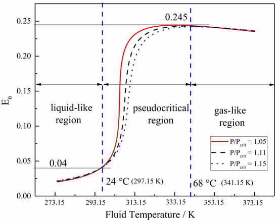 The heat transfer characteristics of supercritical fluids are significantly influenced by the thermal properties, which can lead to the formation of different heat transfer regimes. To illustrate the dramatic change in physical properties with temperature and pressure in the pseudocritical region, a thermal expansion factor (, Equation (1)) proposed by Kurganov [25,26] was used to represent the different regions.