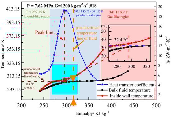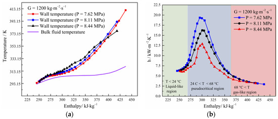 Figure 4 shows the distribution characteristics of the wall temperature and heat transfer coefficient in the vertical upward flow under typical operating conditions. As can be seen, heat transfer coefficient presents an increasing and then decreasing trend, with a maximum value at the pseudocritical point. The wall temperature increases gradually with the enthalpy, remaining essentially constant under the pseudocritical region and continuing to rise as it moves into the gas-like region. Meanwhile, the pressure of P = 7.62 MPa and G = 1200 kg·m−2·s−1 corresponds to a pseudocritical temperature of 32.4 °C (305.55 K). When the bulk fluid temperature and wall temperature are 30.82 °C (303.97 K) and 34.89 °C (308.04 K), the corresponding heat transfer coefficient has a peak value of 19.35 kW·m−2·K−1. The analysis of the data shows that the heat transfer coefficient peaks when the wall and bulk fluid temperatures are distributed on either side of the pseudocritical temperature. An enhancement in the heat transfer coefficient exists before the pseudocritical point of the fluid. The heat transfer coefficient in the pseudocritical region is significantly greater than in the liquid-like and gas-like regions. The characteristics of this study are in line with the viewpoints of others [27]. The reason the peak phenomenon was caused was that the dramatic change in density near the pseudocritical region induced the buoyancy effect and flow acceleration effects [14,16,28].