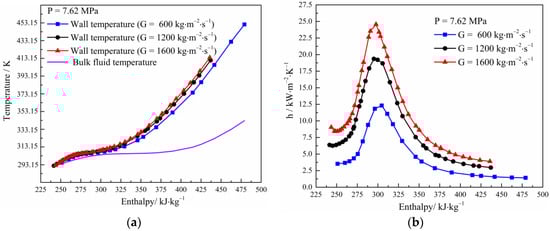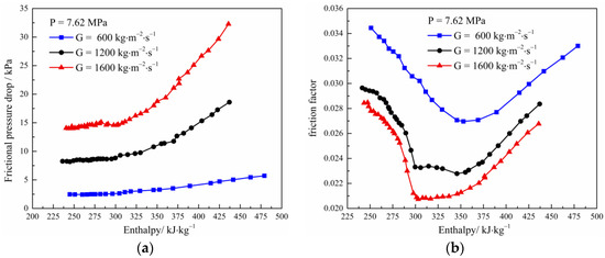 The variations in wall temperature and heat transfer coefficient for a pressure of 7.62 MPa and a mass flux ranging from 600 to 1600 kg·m−2·s−1 are presented in Figure 5. There is a slight increase in wall temperature as the mass flux increases. This is mainly due to the gradual increase of heat flux resulting in a slight change in wall temperature, which is inconsistent with the trend of decreasing wall temperature with increasing mass flux under constant heat flux [29]. The heat transfer coefficient increases as the mass flux increases. This is caused when the heat transfer coefficient is proportional to the Re and an increase in mass flux increases the turbulence of the fluid-enhancing heat transfer [10]. It can also be seen that the heat transfer peaks around the pseudocritical point for the different mass flux values. Figure 6 shows the trend of pressure drop and friction factor with fluid enthalpy under the different mass flux values. Under the low mass flux, the friction pressure drop tends to change slowly with enthalpy; as the mass flux increases, the rate of increase in the frictional pressure drop with enthalpy increases. The frictional pressure drop tends to increase overall with increasing mass flux, while the friction factor tends to decrease. The friction factor shows a decreasing and then increasing trend with enthalpy, with a depressed value near the pseudocritical point. This feature has similarities to the friction distribution characteristics of supercritical water [30], with the depression value created by the change in physical properties between the near wall and bulk flow near the pseudocritical region.