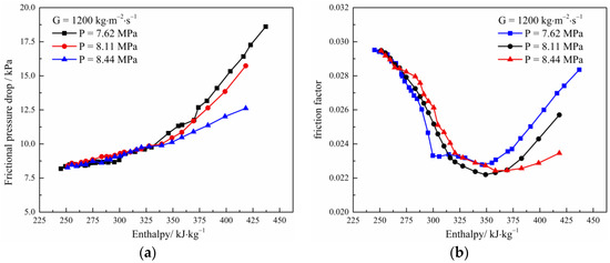 Variation of frictional pressure drop (a) and friction factor (b) with enthalpy under different pressures.