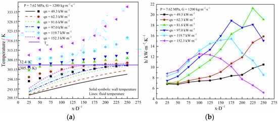 The wall temperature and heat transfer coefficient along the heating length are depicted in Figure 9. The experimental condition contains P = 7.62 MPa, G = 1200 kg·m−2·s−1, and heat flux from 49.3 kW·m−2 to 152.3 kW·m−2. The wall temperature increases with the heat flux, and its temperature rise rate gradually accelerates with the increase in the heating length. The bulk fluid temperature increases gradually with the increase of the heat flux, and at the convergence to the pseudocritical temperature, the rate of increase slows down and does not increase with the increase of the heat flux. The heat transfer coefficient tends to increase along the heating length when the heat flux increases from 49.3 kW·m−2 to 81.6 kW·m−2. While the heat flux continues to increase from 81.6 kW·m−2 to 152.3 kW·m−2, the heat transfer tends to increase and then decrease along the length of the tube. The maximum heat transfer coefficient peak gradually moves away from the outlet and towards the middle. By comparing the correspondence between the wall temperature and the heat transfer coefficient, it can be found that when the wall temperature is higher than the pseudocritical temperature and the fluid temperature is lower than the pseudocritical temperature, the heat transfer coefficient along the tube length decreases with the increase of the heat flux. When the wall and fluid temperature are lower than the pseudocritical temperature, the heat transfer coefficient along the tube length increases with the increase of the heat flux.