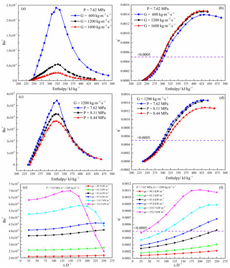 Figure 10a,b show the variation of the buoyancy forces and thermal acceleration with enthalpy for a pressure of 7.62 MPa and a mass flux of 600–1600 kg·m−2·s−1. It can be seen that the value of the buoyancy forces effect Bo* increases and then decreases with enthalpy for the different mass flux values, but the maximum value is less than the negligible threshold value of 5.6 × 10−7, so the buoyancy force effect is negligible at this parameter. The flow thermal acceleration effect decreases as the mass flux decreases, but to a lesser extent. The flow thermal acceleration effect is smaller than the negligible threshold () in the low region and is much larger than the negligible threshold in the high-enthalpy region. The effect of thermal acceleration on heat transfer is therefore not negligible under different mass flux values. Figure 10c,d show the trends of the buoyancy force and thermal acceleration with fluid enthalpy for different pressures at a mass flux of 1200 kg·m−2·s−1. The dimensionless number Bo* for buoyancy effects at all three pressures is small and does not exceed the limit value of 5.6 × 10−7. The thermal acceleration effect values partially exceed the negligible threshold value of 0.0005 at all three pressures. As the pressure increases from 7.62 MPa to 8.44 MPa, the thermal acceleration does not change with increasing pressure under the low-enthalpy region and decreases with increasing pressure under the high-enthalpy region. Therefore, the buoyancy force effect is negligible, and the thermal acceleration effect is not negligible at the pressure of 7.62 MPa to 8.44 MPa. A similar conclusion was obtained under the different heat flux value (shown in Figure 10e,f). The above analysis shows that under the test conditions of mass flux of 600–1600 kg·m−2·s−1, pressure of 7.62–8.44 MPa, and heat flux 49.3–152.3 kW·m−2, the effect of buoyancy force on heat transfer can be neglected in the vertical upward flow of the mini channel in this test condition, while the thermal acceleration effect is not negligible.
