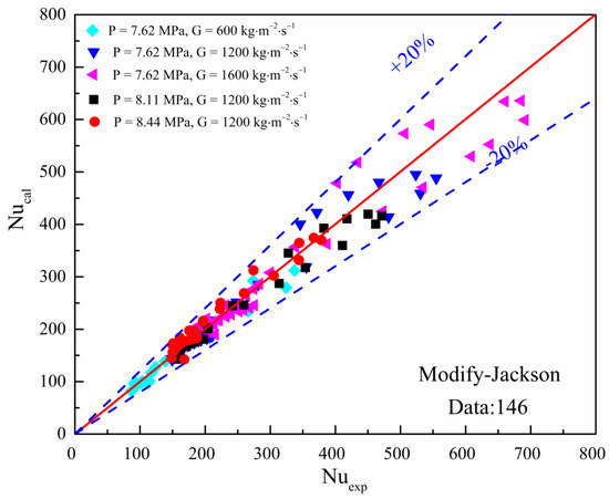 In this study, the flow acceleration effects play a vital role in heat transfer in the mini vertical upward tube. Therefore, the correlation should introduce the dimensionless number () to present the flow acceleration effect. Based on vertical upward experimental data, the modified Jackson correlation was fitted by taking into account the flow thermal acceleration effects. Thus, in the present research, a new heat-transfer-predicting correlation for the mini vertical upward flow at supercritical carbon dioxide is presented as follows: