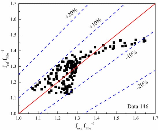 where is calculated using the Filonenko correlation. The viscosity and density correlations of bulk and wall flow were introduced in Equations (5) and (6). Figure 12 presents the comparison of experimental and predicted friction factors using Equation (3). The mean error (ME), mean absolute error (MAE), and root mean square error (RMSE) of the equation for predicting the friction factor and experimental data were 0.09%, 4.529%, and 5.34%, respectively. Approximately 96.57% of the predicted data deviated from the test values within an error band of ±10% and all predictions fell within the ±20% error band. The density and viscosity modification was useful to improve the accuracy.