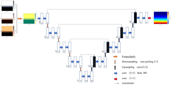 In the simulation of the temperature field by the finite element method, the debugging of parameters and the personnel experience will have a great influence on the results. The UNet is a neural network consisting of a classical encoder–decoder framework to discover hidden features or patterns in data [30]. The UNet’s powerful nonlinear mapping ability can be used to explore a relationship between a temperature field and rock parameters and reduce the influence of parameter debugging and human factors. We propose a HDRT–UNet method for establishing the functional relationship between the thermal diffusivity and the temperature fields.