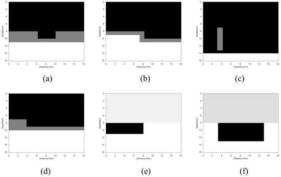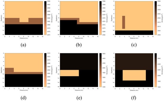 The density parameters of six geological models (a–f) for the training data set: (a) Graben model, (b) pleated–structure model, (c) magmatic intrusion model, (d) platform model, (e) magmatic intrusion model, (f) magmatic intrusion model.