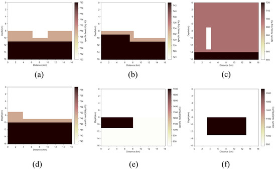 Specific heat capacity of six geological models (a–f) for the training data set: (a) Graben model, (b) pleated–structure model, (c) magmatic intrusion model, (d) platform model, (e) magmatic intrusion model, (f) magmatic intrusion model.