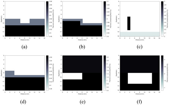 Thermal conductivity of six geological models (a–f) for the training data set: (a) Graben model, (b) pleated–structure model, (c) magmatic intrusion model, (d) platform model, (e) magmatic intrusion model, (f) magmatic intrusion model.