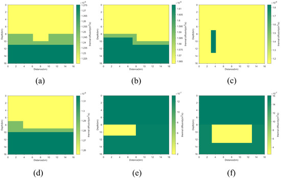The calculated thermal diffusivity of six geological models (a–f): (a) Graben model, (b) pleated–structure model, (c) magmatic intrusion model, (d) platform model, (e) magmatic intrusion model, (f) magmatic intrusion model.