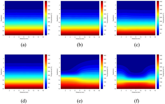 The temperature field labels of six geological models (a–f) from the training data set. (a) Temperature field of Graben model, (b) temperature field of pleated–structure model, (c) temperature field of magmatic intrusion model, (d) temperature field of platform model, (e) temperature field of magmatic intrusion model, (f) temperature field of magmatic intrusion model. The finite element method was used to simulate the heat conduction of the model, the temperature field after 100,000 years was simulated, and the label was established.