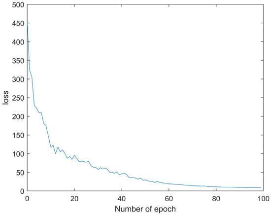 We used 0.001 as the initial learning rate; the learning rate was attenuated using the cosine–annealing algorithm [32]. We selected 32 and 100 for the batch size and epoch, respectively. We used the Adam algorithm to optimize the learning objectives [31]. Figure 8 shows the change in the value of the loss function during network training. As shown in the figure, the loss value dropped rapidly in the epoch from 0 to 40, slowed down in the epoch from 40 to 80, and reached a lower value near the 80th epoch and tended to be steady.