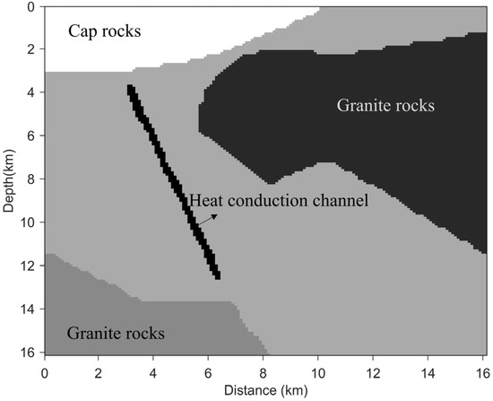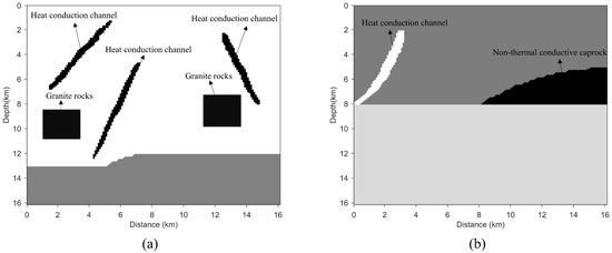 Two–dimensional (2D) geological model. (a) The first model consist of the heat conduction channels and granite with high thermal conductivity; (b) The second model contains fractures and caprock.