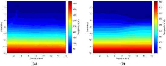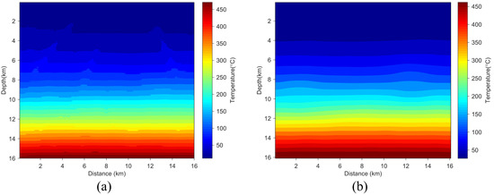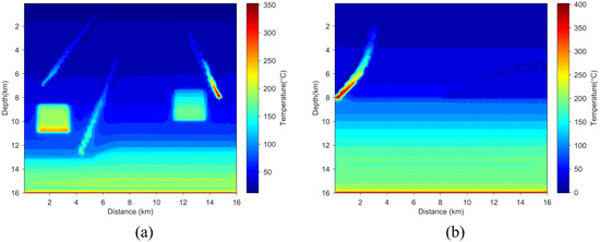 In this section, we test the effectiveness of the network based on the training data. We designed two geological models with a size of 16 × 16 km as shown in Figure 9. The geological model in Figure 9a contains the heat conduction channels and granite with high thermal conductivity, and the geological model in Figure 9b contains a heat conduction channel and a non–thermal conductive caprock. We simulated the temperature field by using the finite element method and HDRT–UNet, respectively, and the corresponding simulation results are shown in Figure 10 and Figure 11.