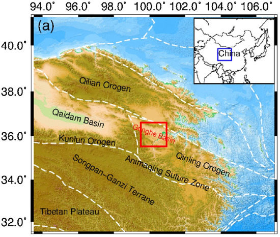 As the transitional zone between Qilian Mountain and Kunlun Mountain (Figure 12), the Gonghe Basin has the advantages of wide distribution, good lithological conditions and abundant hot dry rock resources [33]. The high–temperature mass drilled in Gonghe Basin is the first large–scale available hot dry rock resource with a temperature above 200 °C. There are many cap rocks, faults and magma intrusions in the Gonghe Basin [34]. In terms of stratum, the Gonghe area is mainly dominantly covered by thick Cenozoic deposits, including mudstone, sandy mudstone, sandstone and glutenite in the Quaternary, Neogene and Paleogene strata [35]. Triassic formations and Indosinian acidic magmatic rocks are also present [36].