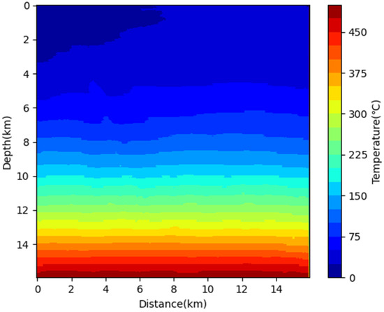 The limitation of our approach was that the simulation ability of the network predominantly depended on the data set. In general, the training data set should contain the rock parameters and structural characteristics of the 2D geological model to be predicted. That is, the supervised learning network used for the prediction has a direct impact on the selection of training data sets and the amount of data. Figure 15 shows the prediction result of the HDRT–UNet of the geological model of Figure 9 when there were no heat conduction channels in the data set. Figure 15 shows that there were obvious errors in the results of temperature field simulation, because the HDRT–UNet had not learned the parameters and structural characteristics of the heat conduction channels, and it was under–fitting when using the HDRT–UNet to simulate the temperature field. In most cases, a large number of large–scale and varied training samples will make the HDRT–UNet more powerful, but the training process takes longer.
