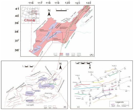 The Bohai Bay Basin is located in the eastern part of the north China craton [10]. It is a Mesozoic and Cenozoic sedimentary basin, bounded by the Tan-Lu Fault Zone on its eastern side and the Taihang Mountain east fault zone to the west [11]. Right-lateral strike-slip and extensional faults have contributed to form the current shape of the basin [12,13]. Sixty-five fault depressions are found above the basement, which are mainly controlled by four sets of faults striking towards NNE, NE, NW and WNW [14]. The Bohai Bay Basin is segmented by the Cangxian and Chengning uplifts and others into several depressions, namely Hebei, Linqing, Huanghua, Jiyang, Liaodong Bay and Liaohe depressions [14]. In the Neogene period, the basin got tectonic stability and the fault activity decreased, while slow rifting in the basin is still experienced [15].