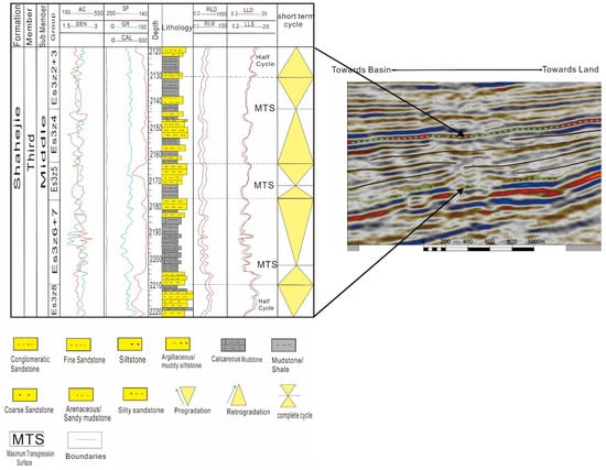The top (Es3z2+3) and bottom (Es3z8) boundaries of the sandstone groups are regional unconformities and other sandstone groups are bounded in a conformable manner within these boundaries [18]. Sharp lithological contact like truncation of sandstone that underlies the mudstone was kept as a marker bed for the correlation of sandstone groups. Sedimentary facies within each sandstone group was analyzed and correlated within a sequence stratigraphic framework, and the top sand groups act as datum plane, however in order to show the actual steepness profile in correlation, we did not flatten it. Five sandstone groups or units in the third order sequence experienced progradation, retrogradation–progradation, and retrogradation stacking patterns (Figure 2). The Es3z8 sandstone group has a half cycle, in which progradation or a fine to coarsening upward sequence is observed (Figure 2). The complete cycle of retrogradation (coarsening to fining upward sequence) to progradation para sequences (fine to coarsening upward sequence) are interpreted in the Es3z6+7, Es3z5 sand groups, whereas the Es3z4 sandstone group is separated by maximum transgression surface and the Es3z2+3 sand group contains progradation to retrogradations para sequences (Figure 2). Sandstones, mudstones, and siltstones or argillaceous siltstones are found in alternating patterns in reservoir zones (Figure 2).