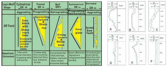 Modified typical trends of gamma ray log shapes at left after Selley and Nazir [19,20], Demonstration of typical logs from study area (A) High amplitude funnel-shaped to interpret mouth bars, (B) Box-shaped trend to interpret distributary channel, (C) Bell-shaped curve for identrifying the distributary channel, (D) Finger or serrated shaped curve to identify the sand sheet, (E) Low amplitude funnel-shaped to recognize the natural levee, (F) High amplitude curve to interpret the interdistributary mudstone [18].