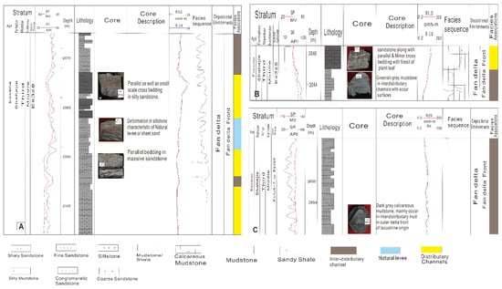 All core wells were encountered at target depths of required sandstone layers. Depth of the recoverable cores are often matched with the actual value of log at a certain depth. To avoid uncertainty, the depths of cores are carefully checked and regulated by well logs. Depositional facies are described on the basis of criteria defined by Nazeer and Selley (1978) (Figure 3) [19,20] and analysis of gamma ray and spontaneous potential curves that contain different kinds of trends associated with specific depositional environment and facies associations (Figure 3). These trends have been matched in well logs with cores while interpreting the facies and further compared with resistivity logs to maintain accuracy of results. We made different sections in the form of columns for clear interpretation of well logs, sand groups, lithologies, core description and sedimentary facies. Sedimentary facies within each sandstone group are analyzed in terms of lithofacies, facies associations in respective depositional environments. For the clear visualization of cores, we also dispatched core photos in high resolution in separate columns and explained the lithological characteristics, with a description and their interpretation (Table 1).