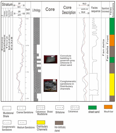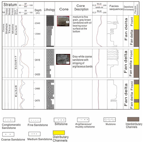 The delta front is divided into inner and outer components. Facies associations recognized in the inner and outer fan delta front within the five sand groups namely: Es3z2+3, Es3z4, Es3z5, Es3z6+7 and Es3z8 units that have never been defined in detail by previous researchers [3,7,22,23,24]. As the Es3z shows a second-order sequence that is mainly characterized by variegated sandstones from coarse to medium and fine grain along with mudstone (Figure 4) [5,7] but with lithology, detail facies analysis of sandstone groups in the Es3z sub-member has been less discussed in previous studies except for the overall stratigraphy and facies of the third sub-member of Es3 [25,26].