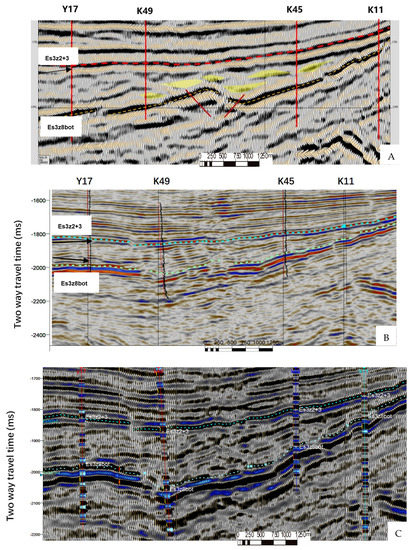 We were interested to deduce facies of the Es3z middle sub-member. The seismic section was mapped to figure out the information between the top (Es3z2+3) and bottom (Es3z8) of the sandstone groups (Figure 10). These surfaces have prominent amplitude with erosional surfaces but overall possess good continuity. Representative seismic sections are demonstrated to analyze the facies in south to north, and east to west directions (Figure 10 and Figure 11). Deltaic chloroform’s truncation is observed in sandstone units in extensional settings (Figure 10). The above area lies in the clinoform’s setting, in which depositional surfaces display a wedge-shaped sloping pattern (Figure 10). The highlighted truncation in Figure 10 demonstrates the clinoform’s area, as all reflectors are not parallel and the overall seismic profile displays the wedge-shaped slope region in weak lithologies of fine sandstone siltstones and mudstones in wider beds. Normal faults are also observed, some of layers are separated, and the throw of faults seem to be higher. These faults trigger to move the sediments further towards the basin side in a prograding manner (Figure 11). Three major sequence boundaries were observed with good seismic reflections, and prograding reflectors are bounded between these sequences. Onlap reflection terminations are observed in the lower and upper boundaries (Figure 10 and Figure 11). The negative amplitude of red or lighter red color contains siltstones, sandstones, and argillaceous contents, while mudstones are presented as positive amplitude that are lighter gray in color (Figure 11). Whereas brighter reflections are considered to have conglomerates in sandstone bodies. Argillaceous content increases along with silty content when the velocity of channels are reduced and sediments are deposited on distal sides, which is shown both laterally and vertically (Figure 11).